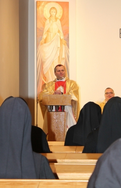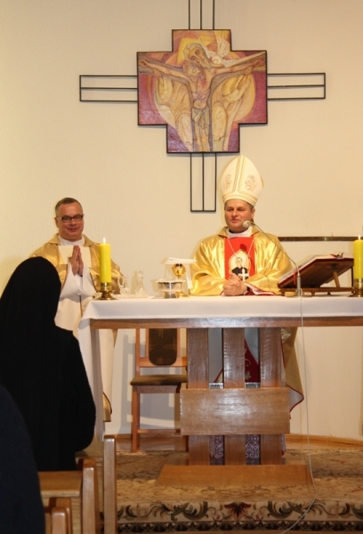 W dniu dzisiejszym Bp Leszek odprawił w Kaplicy Domu prowincjalnego Mszę świętą w intencji Zgromadzenia. W koncelebrze modlił się również Kapelan wspólnoty ks. Bogdan Węgrzyn. W homilii nawiązując do okresu liturgicznego Wielkiego Postu Ks. Biskup zauważył, że istnieje pokusa niedostrzeżenia Boga, Który nieustannie przychodzi. Nawrócenie zatem polega na trosce o trwanie w stanie łaski uświęcającej co wyraża się w „życiu w obecności Boga, na spotkaniu z Nim, na przyjęciu tych darów, które Bóg nam daje każdego dnia.(…) Bóg przychodzi by mi błogosławić w takich okolicznościach, w takiej sytuacji mojego życia w jakiej się teraz znajduje.” Wspominając początki istnienia Zgromadzenia spostrzegł, że „warto sobie uświadomić, że 132 lata temu tam we Lwowie było święto. I była nie tylko radość Waszego Założyciela i tych pierwszych sióstr, które zgromadziły się wokół niego, ale tam przede wszystkim dokonywało się wszystko w atmosferze przyjęcia Bożej łaski. Tam był Bóg, Który błogosławił temu dziełu, Który sam nadał temu dziełu określony charakter, charyzmat. I dzisiaj wspominając to pierwsze dotknięcie Bożej łaski nie wolno nam zapomnieć, że w ciągu tych 132 lat Bóg zawsze był i zawsze błogosławił i nadal pragnie błogosławić temu dziełu. Pragnie błogosławić każdej z Was, by to co nazywamy świętością Zgromadzenia było znakiem dla współczesnego świata. I jest to wielka odpowiedzialność, aby ten charyzmat który otrzymałyście od Waszego Założyciela przekazać dalej.” Na koniec Ks. Biskup życzył siostrom: „Zachęcam Was, by ten dzień był przeżyty w wielkiej radości i wdzięczności za to dzieło, które jest Waszym dziedzictwem i jednocześnie z wielką nadzieją, że to wszystko czym zostałyście obdarowane ma być przekazywane dalej. Od każdej z Sióstr zależy bardzo wiele, bo każda z Was przede wszystkim objawia światu dobroć Boga. I poprzez Was Bóg chce obdarzać swoją łaskawością i swym błogosławieństwem innych ludzi.” Ksiądz Biskup podziękował Siostrom za ofiarowane w jego intencjach modlitwy i podarował obrazki z prosbą o dalszą pamięć.