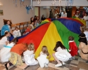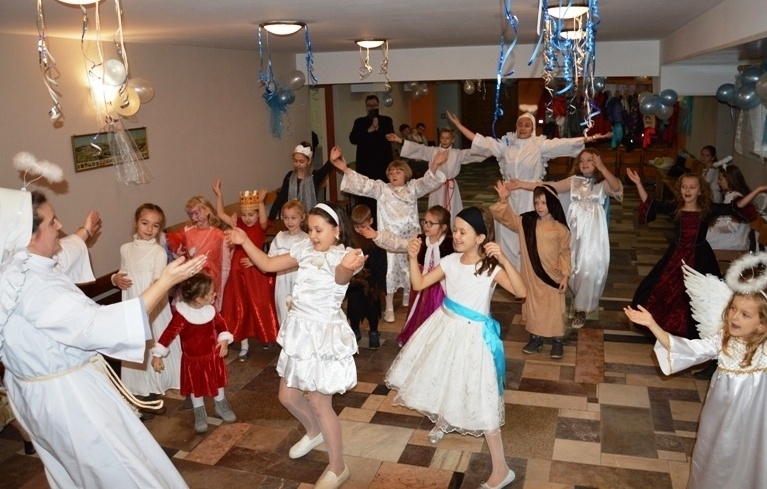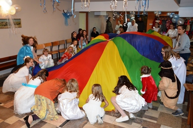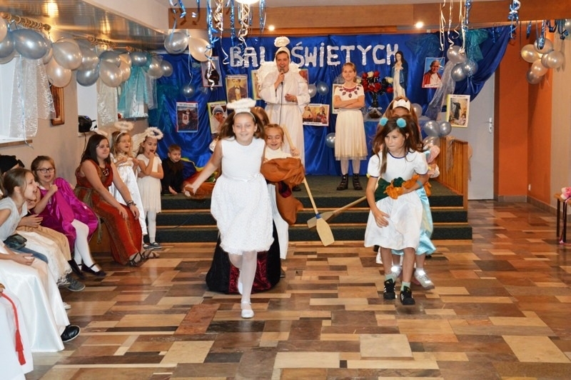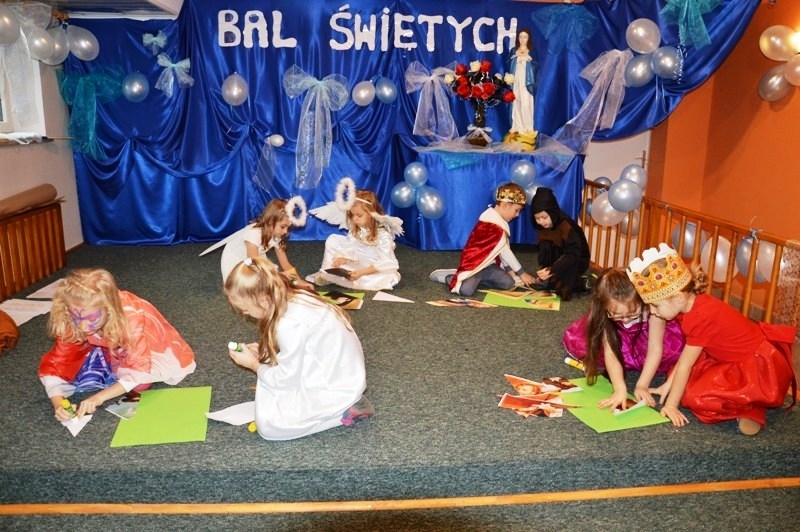 Udział w spotkaniu ewangelizacyjnym wzięły dzieci należące do grup parafialnych m.in. Scholii, Dziewczęcej Służby Maryjnej, Ministrantów oraz dzieci ze „Świetlicy pod Aniołem”. W pięknych strojach przedstawiających Świętych – znanych i mniej znanych, przy wspólnej zabawie animowanej przez Siostry i Księdza Mariusza Mołasa, dzieci uczyły się przeżywać zgodnie z wiarą Uroczystość Wszystkich Świętych. Czas spędzony wśród śpiewu i radości pokazał wszystkim zebranym, że świętość w życiu jest źródłem szczęścia, ponieważ bliska relacja z Bogiem i miłość do bliźnich jest przyczyną prawdziwego, szczerego uśmiechu i entuzjazmu w codzienności.