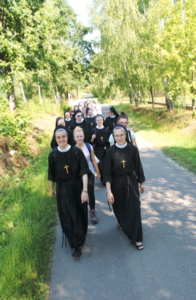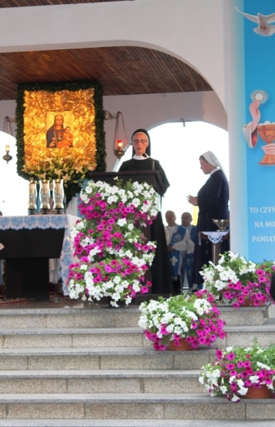 Pielgrzymi wzięli udział we Mszy św. z udziałem osób konsekrowanych o godzinie 15.00. Eucharystii przewodniczył ks. Tadeusz Gniewek, sercanin, a kazanie wygłosił o. Józef Augustyn, jezuita. Dla wszystkich uczestników niemałych zaskoczeniem była nagła ulewa. Nie przeszkodziło to jednak o. Augustynowi w wyłożeniu głębokiego kazania na temat relacji: poczucie własnej niegodności a Boże Miłosierdzie. Ten dzień wypełniony modlitwą, śpiewem i dobrymi spotkaniami był rzeczywiście dniem poświęconym naszej Pani i Matce. Niech Ona, najlepsza z matek, wyprasza nam dar nowych świętych powołań oraz łaskę wytrwania w służbie Miłości Miłosiernej dla każdej siostry naszej Rodziny zakonnej.