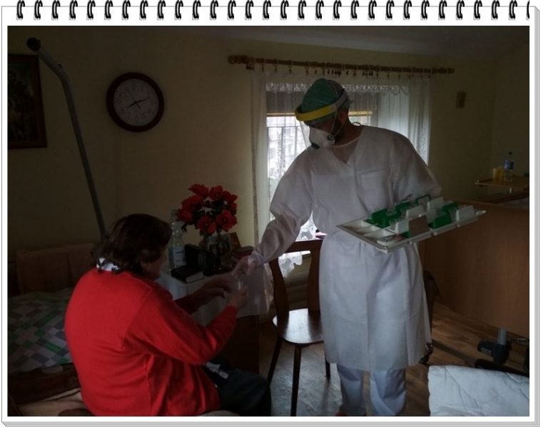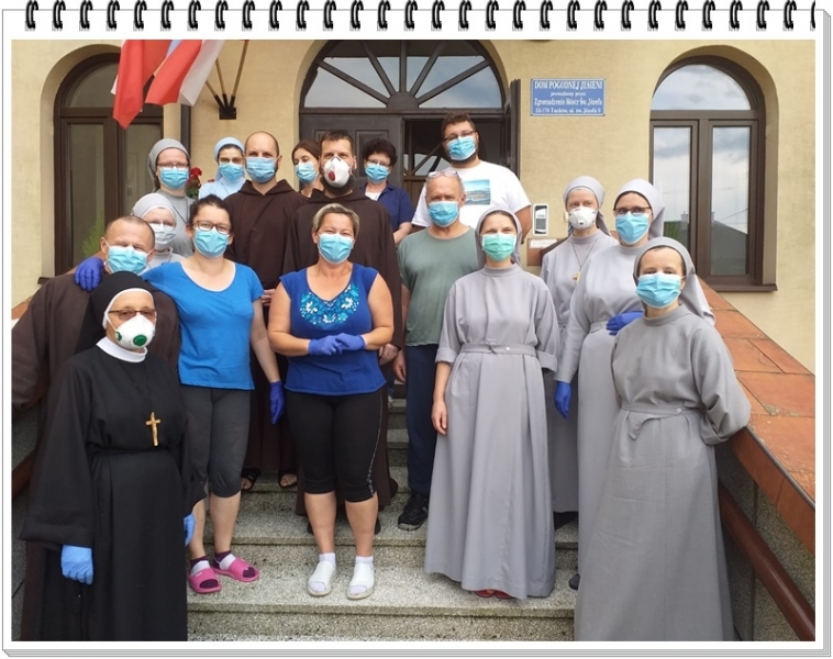 Przyjechała siostra do Domu Pogodnej Jesieni aby zastąpić siostrę dyrektor, która otrzymała wynik pozytywny i musiała udać się do szpitala. Dołączyła siostra do zespołu, w którym pracował już doświadczony ratownik medyczny starający się opanować sytuację. Co siostra zastała na „placu boju” i jak wyglądała wspólna organizacja zarządzania? Pierwsze, co zobaczyłam to czekającego na mnie i uśmiechniętego p. Pawła – ratownika medycznego – którego do tej pory znałam tylko z głosu w telefonie. W tym trudnym czasie wielkiego napięcia i niepokoju, w sytuacji, gdy Dom Pogodnej Jesieni opuścili ostatni zarażeni i oczekiwania czy będą kolejne osoby – ten uśmiech niósł wiele pokoju! Drugie, co zastałam po przekroczeniu progu domu, to śliskie od środków dezynfekcyjnych podłogi – chyba każdy kto wchodził musiał wcześniej czy później „dotknąć” ziemi, bardziej lub mniej boleśnie J. I wiesz, paradoksalnie jest to dla mnie pewna symbolika tego czasu epidemii. Do walki z takim wrogiem: niewidzialnym i mało znanym jak Covid 19 potrzeba pokory! Nie da się do niego podejść z gotowymi rozwiązaniami, wiedzą, doświadczeniem, pewnością siebie, bo można „pogruchotać kości”, ale trzeba roztropności i uważnej obserwacji, aby spostrzec, a nawet próbować uprzedzić kolejne jego działanie! Trzecie, co zobaczyłam to świetnie zorganizowany zespół pod kierunkiem p. Pawła! Byłam bardzo pozytywnie zaskoczona biorąc pod uwagę, że w zdecydowanej większości były to osoby o zupełnie innym profilu zawodowym, nie mające do tej pory kontaktu z pracą w DPS i nie znający siebie wzajemnie. Przebywali w Domu od zaledwie kilku dni a już poznali mieszkańców, analizowali wspólnie ich stan zdrowia i potrzeby, spieszyli na każde ich wezwanie w dzień i w nocy. Pełnili 12, 24 a nawet i zdarzało się 36 godzinne dyżury, gdy osłabł któryś z członków zespołu i potrzebował więcej odpoczynku, ofiarni i pełni poświęcenia, wspierający się wzajemnie w każdej czynności. Trudno to wyrazić słowami…Czwarte to hm… Dom nie przypominał tego Domu, który odwiedzałam wcześniej z piękną estetyką wnętrz, ale naprawdę stał się polem walki! Wiele rzeczy czy mebli zmieniło swoje miejsce, wszystko zlane środkami dezynfekcyjnymi, z foli i taśm porobione śluzy w świeżo remontowanych pokojach. Ze względu na małą ilość osób pracującego zespołu musieli tak zorganizować pomieszczenia, żeby maksymalnie ułatwić sobie dostęp do wszystkich koniecznych do obsługi i pielęgnacji mieszkańców, rzeczy oraz odzieży i środków ochronnych…P. Paweł wraz z zespołem perfekcyjnie zorganizowali w tych ekstremalnych warunkach pracę i na porannych i wieczornych odprawach dokładnie analizowali przebieg działań i tworzyli strategię. Uczyłam się od nich, sama głównie zajmując się administracją i codziennym raportowaniem sytuacji do różnych instytucji. Uzupełnialiśmy się w zarządzaniu z p. Pawłem i z czasem zaczęliśmy się wg potrzeb zastępować.