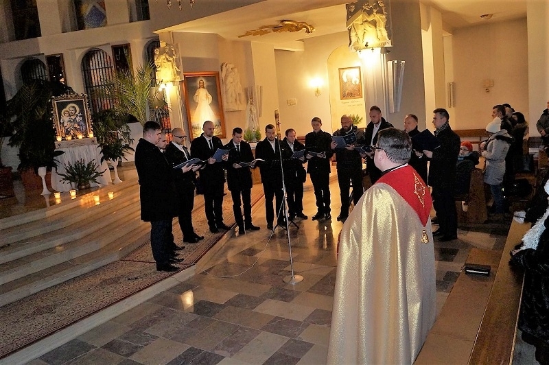 Pomysłodawcą i organizatorem tego modlitewnego spotkania w Wigilię Uroczystości (niedziela 18 marca godz. 19.00) był p. Krzysztof Jędrzejewicz - organista parafii Miłosierdzia Bożego. Męski dwunastoosobowy chór, który zebrał się wyjątkowo na tę okazję na zaproszenie p. Krzysztofa, w trzygłosowym wykonaniu, pięknie wyśpiewał „Chwałę Józefowi Mocarzowi, Zbawiciela Opiekunowi”. Autorem Akatystu jest J. Tomalak.